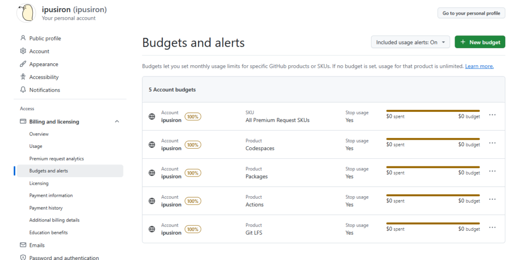 「$0 budget」かつ「Stop usage: Yes」であれば、無料枠を超えても課金されることはなく、Actionsが一時的にブロックされるだけです。月次リセット後に自動的に復旧します。