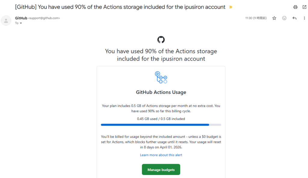 ある日、GitHubから"You have used 90% of the Actions storage included for the ipusiron account"というメールが届きました。
